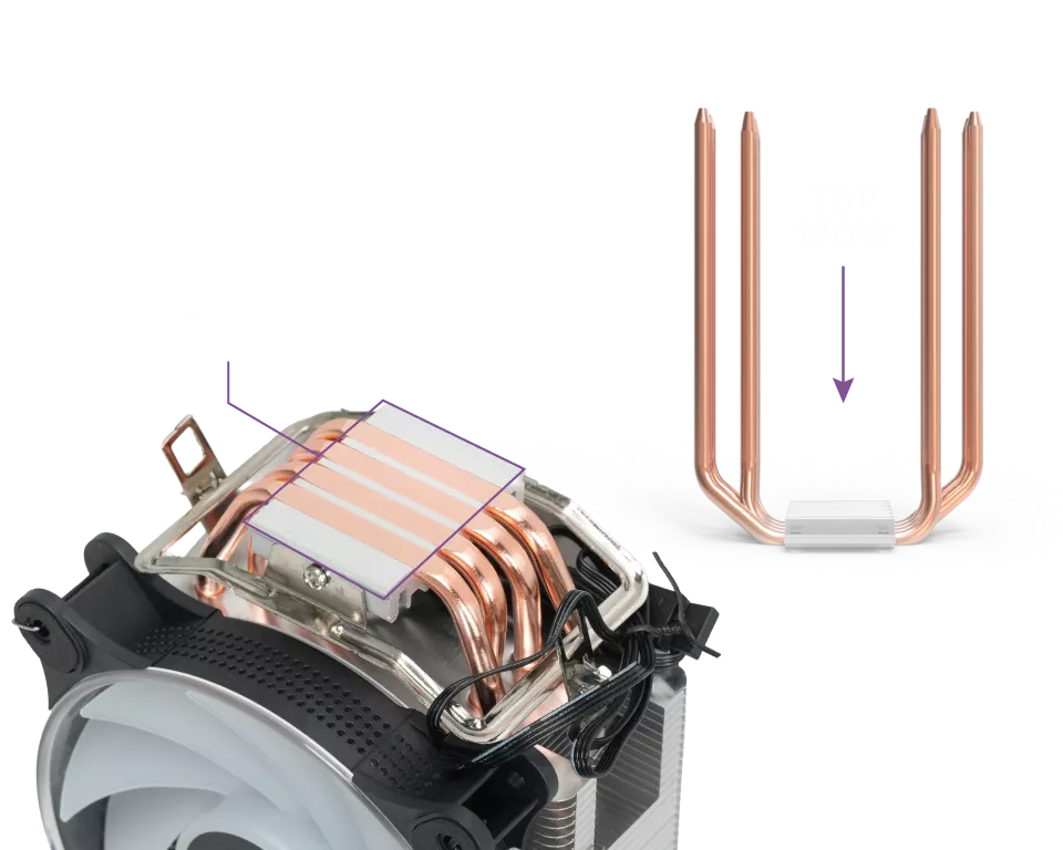 Soporta CPUs de hasta 180W de TDP, gracias a sus 4 ultra eficientes heat pipes, su chasis mejorado con láminas de alta densidad y su ventilador de alto flujo y alta presión de aire con orificios de refrigeración laterales integrados.