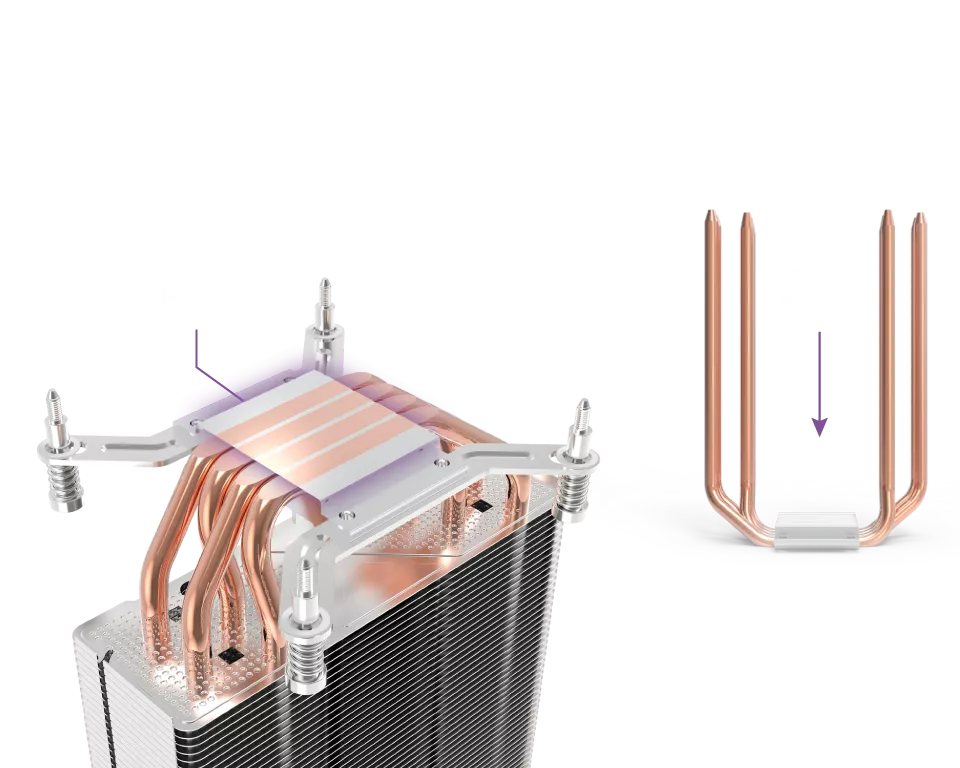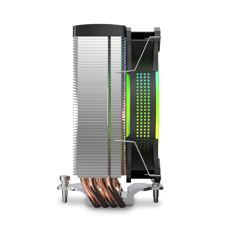 Soporta CPUs de hasta 200W de TDP, gracias a sus 4 ultra eficientes heat pipes, su chasis mejorado con láminas de alta densidad y su ventilador de alto flujo y alta presión de aire con orificios de refrigeración laterales integrados.