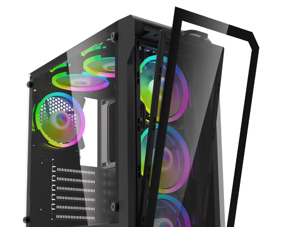 El gabinete CM-8026 combina diseño y rendimiento en una estructura robusta y funcional. Incluye un panel lateral de vidrio templado y un frontal desmontable con malla antipolvo, que mejora la ventilación y facilita el mantenimiento.