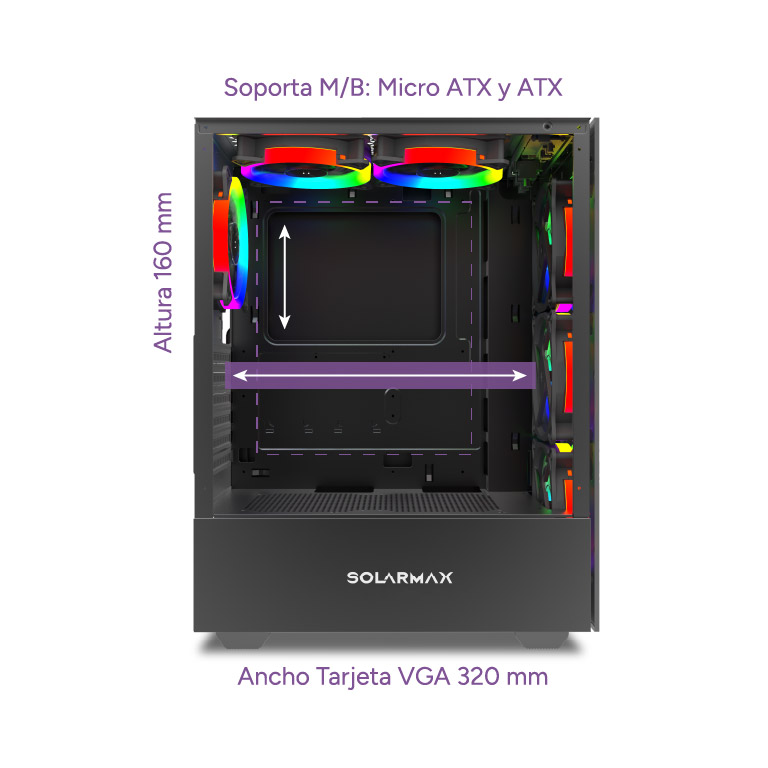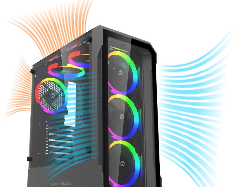 El panel trasero y la parte superior ayudan a disipar el calor, asegurando que el enfriamiento sea efectivo por todos lados.