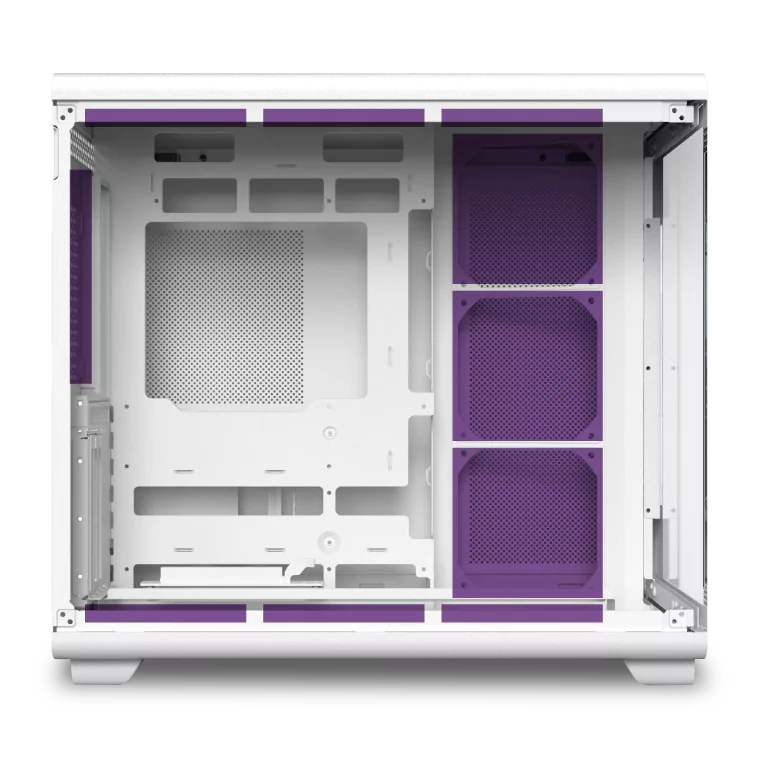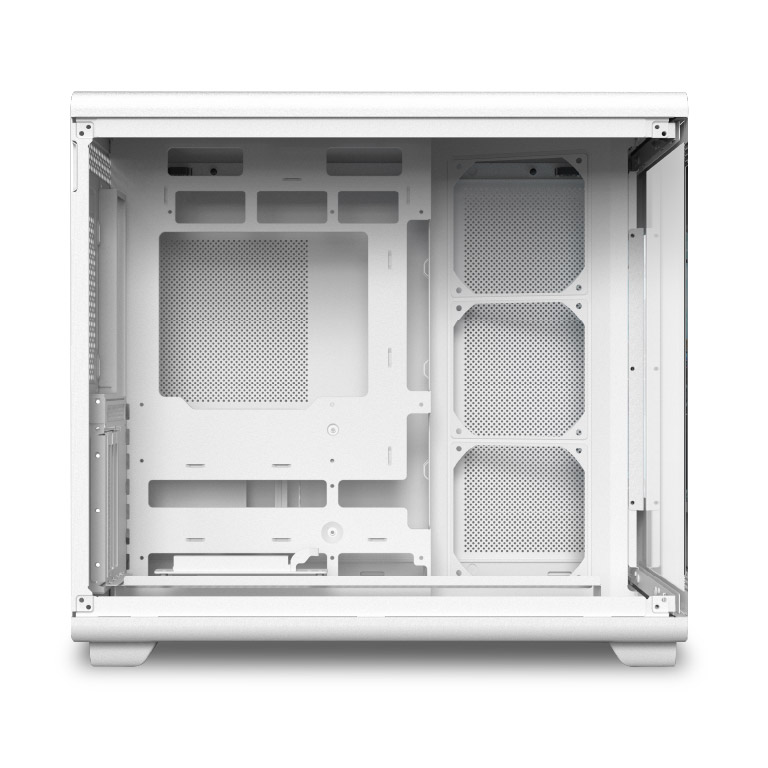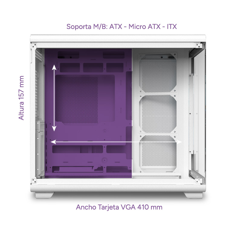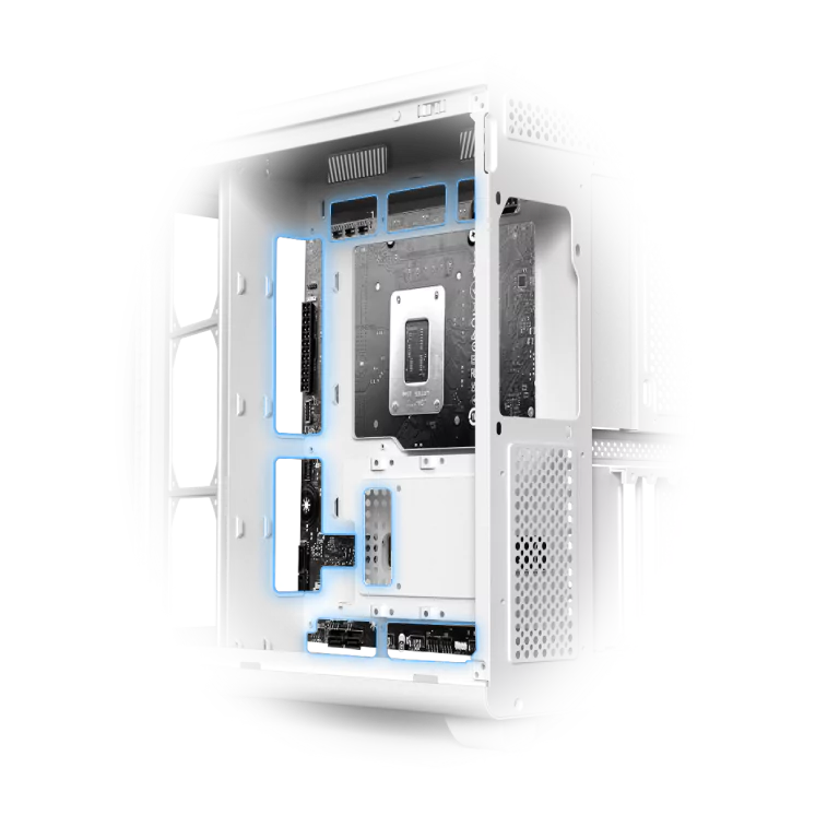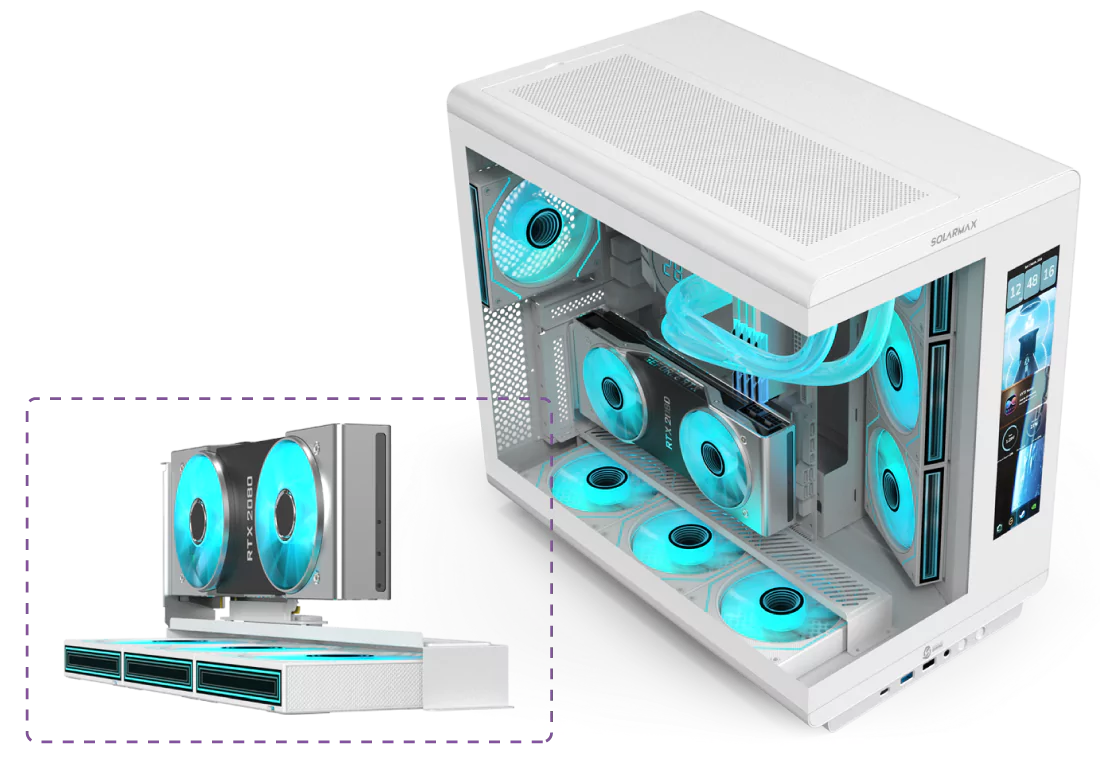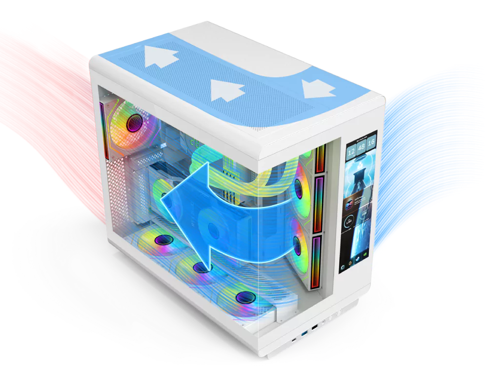 Incorpora un conducto de aire de gran tamaño para un flujo térmico eficiente y una tarjeta gráfica montada en posición vertical suspendida, que potencia tanto el rendimiento como el impacto visual.