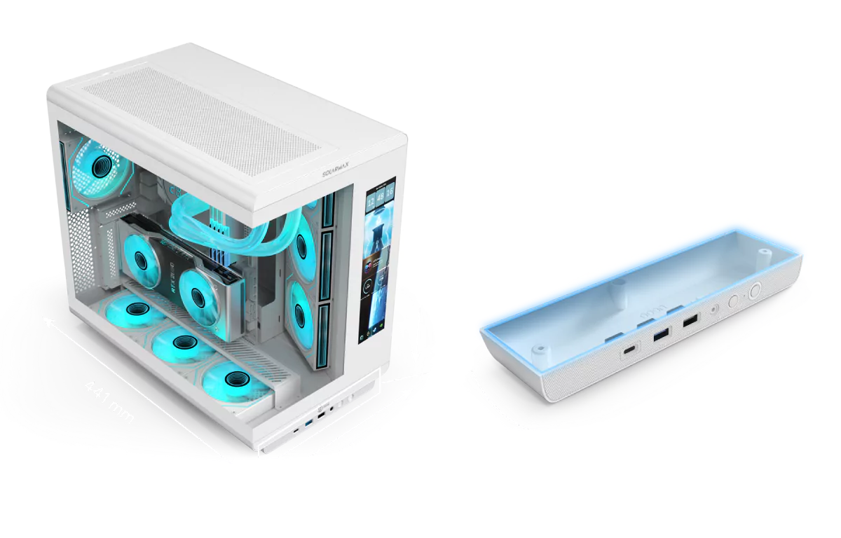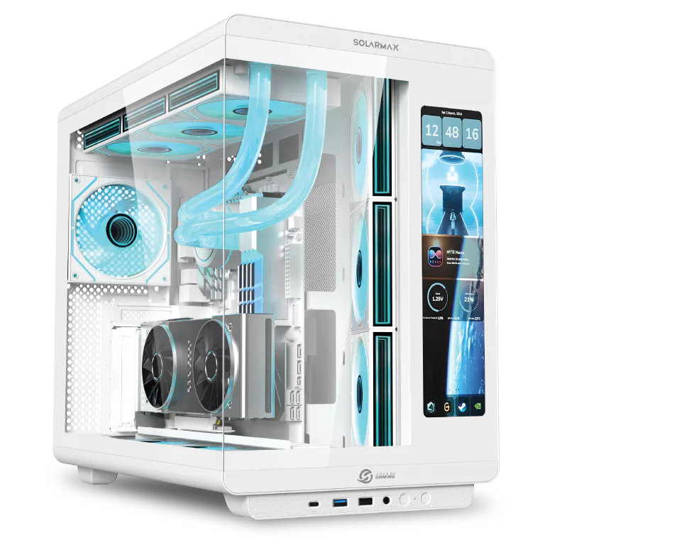 El diseño del CM-W600L redefine la estética gamer con líneas limpias y una estructura elegante, capaz de adaptarse tanto a una disposición vertical como horizontal según el espacio. Su doble panel de vidrio templado continuo ofrece una vista panorámica del interior, mientras que la pantalla LCD de 11.3” te mantiene al tanto del rendimiento en tiempo real a través de un software dedicado que permite monitoreo y personalización.