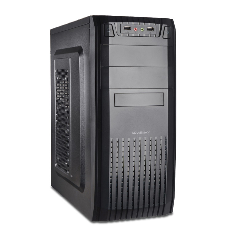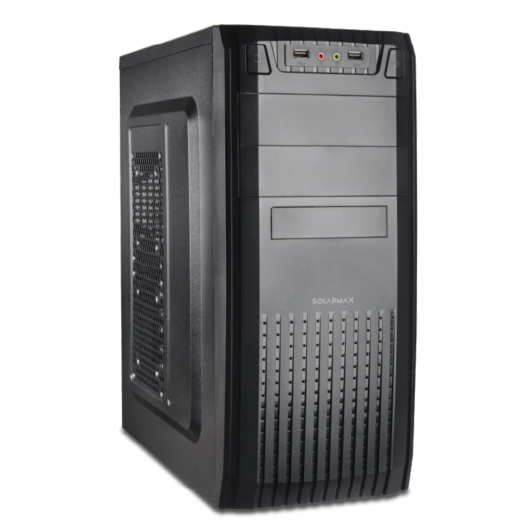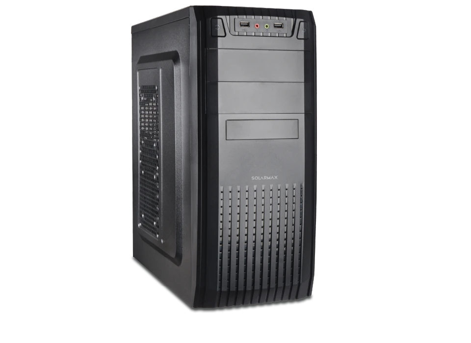 El gabinete incluye teclado, mouse y parlantes Solarmax, proporcionando una solución integral que facilita su uso inmediato sin requerir accesorios adicionales.
