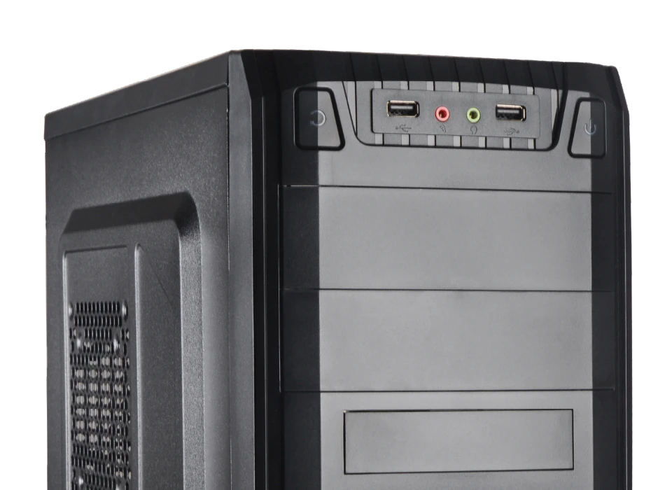 El gabinete CM-5832 incorpora un panel frontal con dos puertos USB, entrada de audio HD y conector para micrófono, diseñados para ofrecer acceso rápido y conveniente a tus dispositivos.