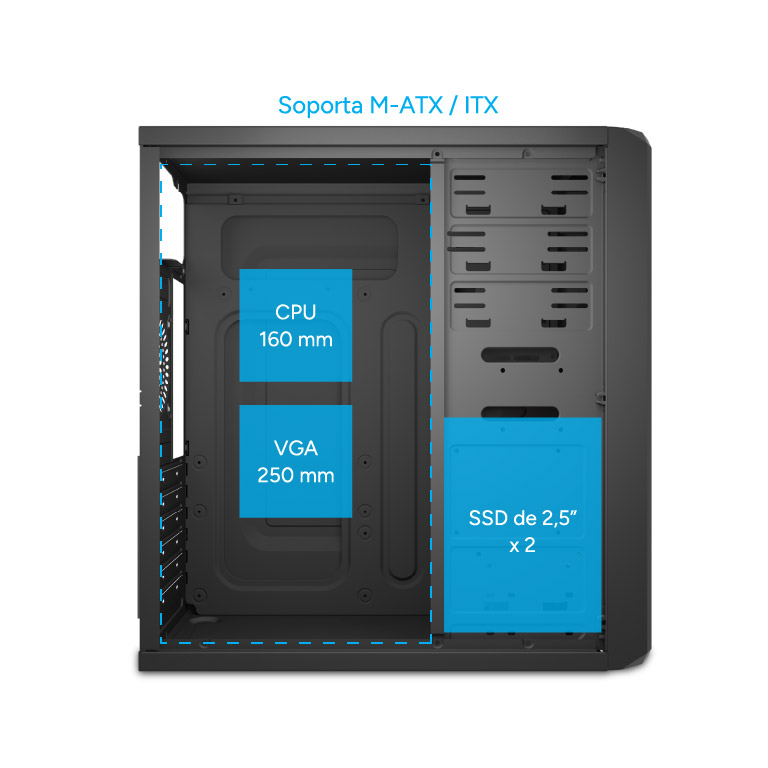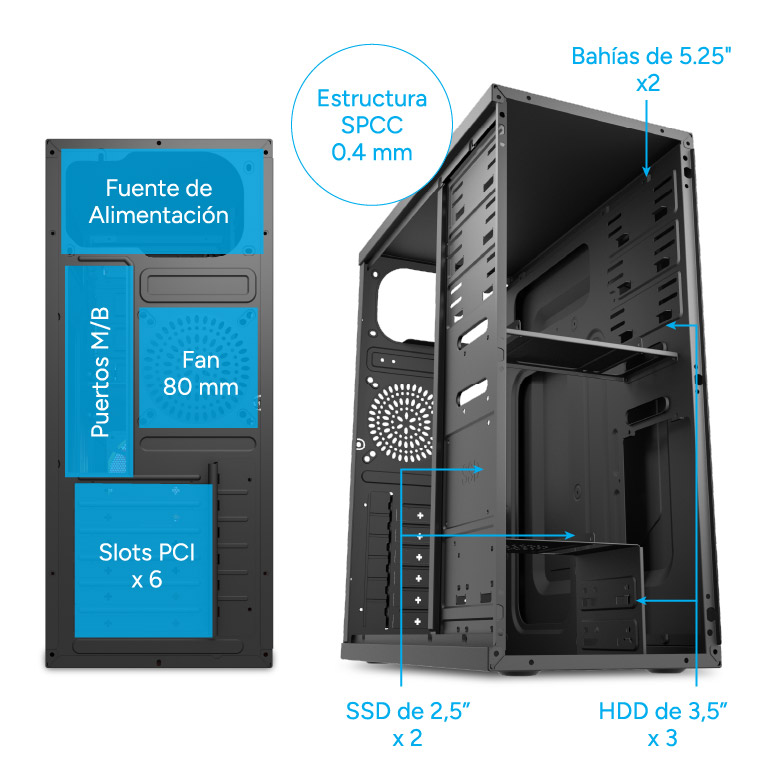 - Bahías Internas: 3.5" x3 + 2.5” x2 + PCI slot x6