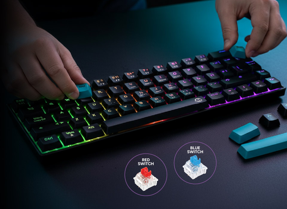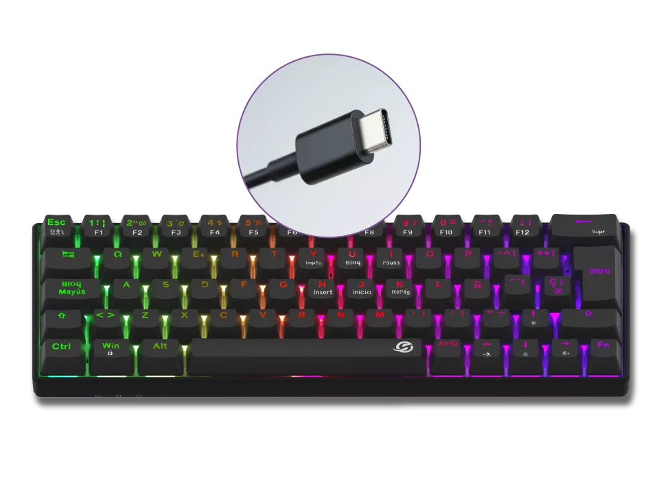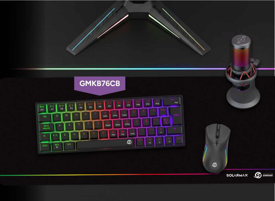 El teclado mecánico gamer GMKB76CB de Solarmax optimiza el espacio de tu setup gracias a su formato super compacto al 60%. Posee 17 modos de retroiluminación sRGB, 64 teclas totalmente intercambiables y keycaps para crear tu propio estilo.